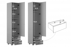 Модуль оснащён одной распашной дверцей и двумя вместительными выкатными ящиками в нижней части, предназначенными для хранения одежды, текстиля или аксессуаров. Внутреннее наполнение можно выбрать в зависимости от потребностей: шкаф может быть укомплектован полками или штангой для плечиков, что делает его удобным для хранения как сложенных вещей, так и одежды на вешалках.